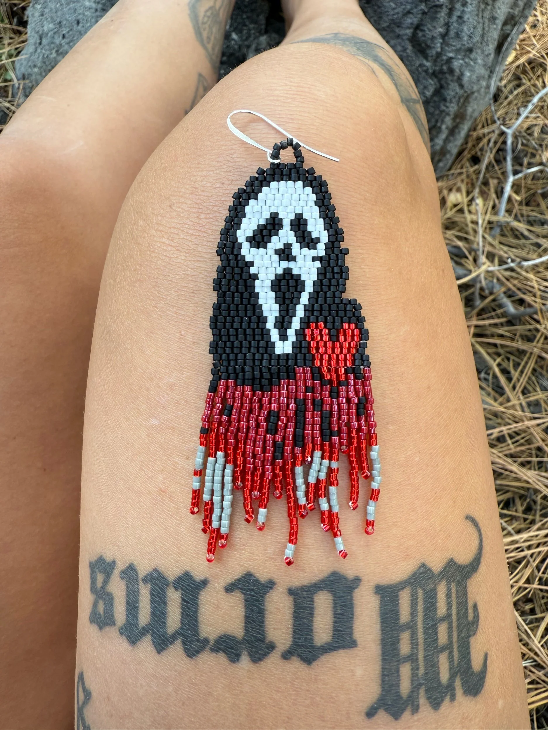 Add a killer touch to your jewelry collection with these handmade Ghostface fringe earrings. Each pair is intricately beaded with bold reds and deep blacks for a statement piece that’s both haunting and beautiful.