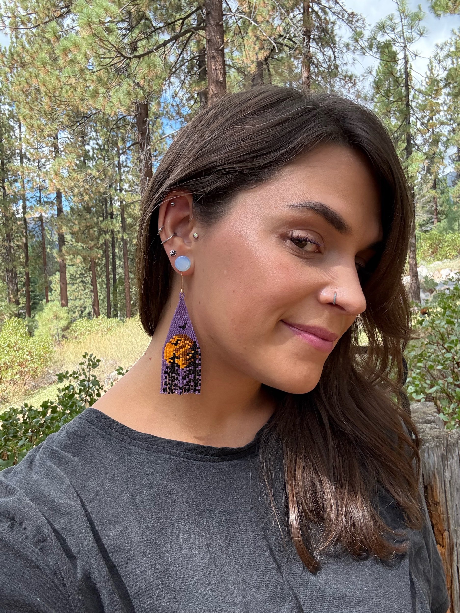 Shadows stretch tall beneath a glowing moon in these handwoven earrings. Each bead forms the silhouette of a quiet forest alive with mystery and motion, finished with flying bats that fade into the night.